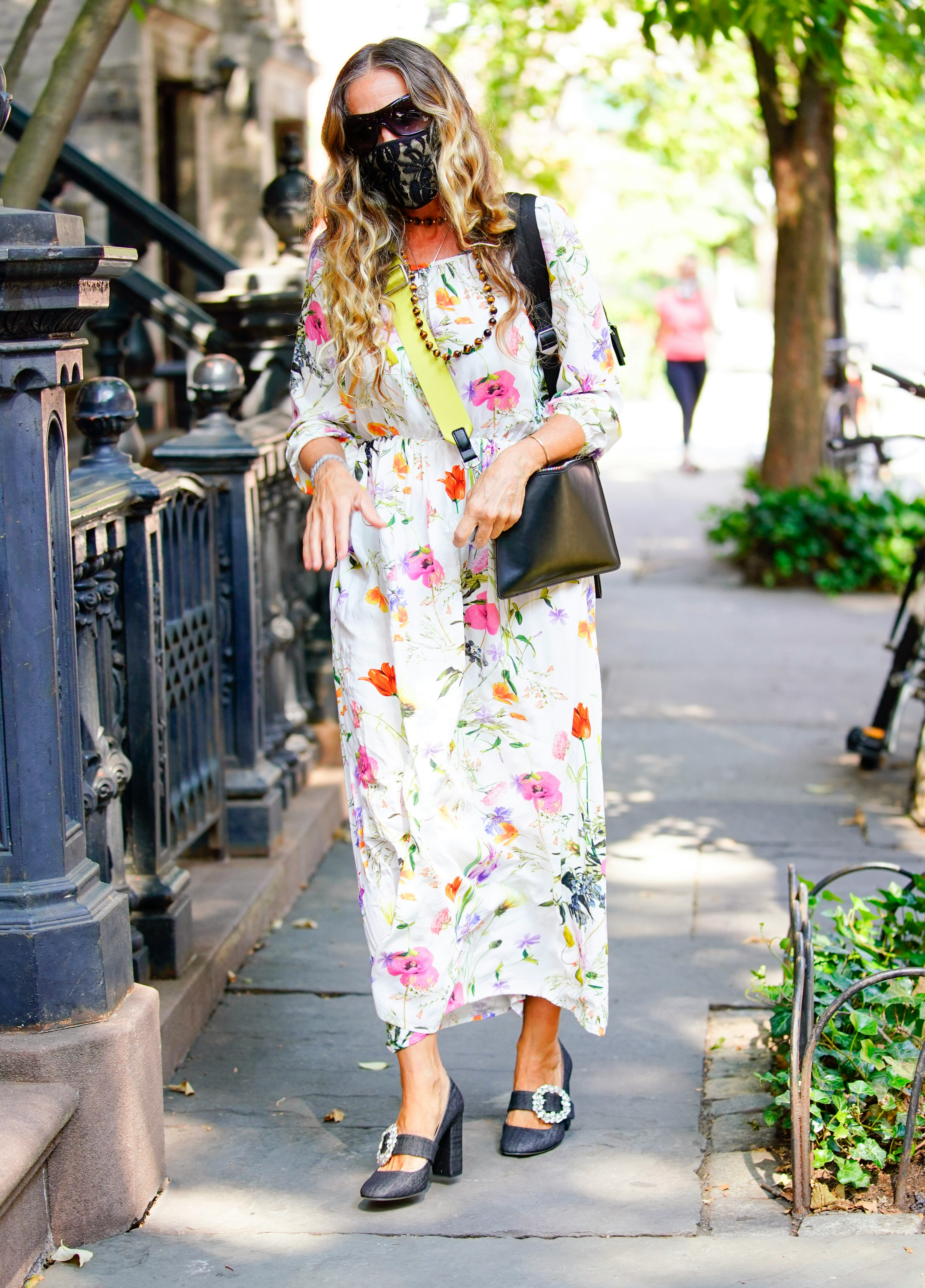 Of late, the Sex And The City star has been working away in the two NYC stores for her namesake SJP Collection. While visiting a store front on Aug. 11, the 55-year-old wore a wildflower print maxi dress with 3/4 sleeves and a cinched waist. For chic protective measures she wore a lace face mask from Masqd (that is still in stock for $28).