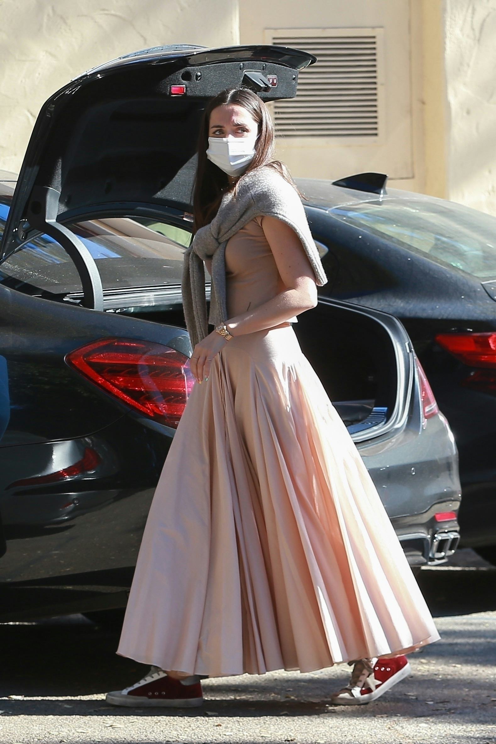 The 32-year-old actor may find herself head-to-toe in sequins on the red carpet, but her day-to-day approach to fashion takes a decidedly more relaxed approach by way of loose-fitting jeans, sundresses, flat sandals, and combat boots. On November 29, de Armas was spotted in Los Angeles wearing a blush pink maxi skirt, which delightfully juxtaposes against the darker tones the actor is often seen in. While Los Angeles has barely dipped below 65 degrees recently, a plush cashmere sweater from Co wrapped neatly around de Armas’ neck serves as both a loose reminder of the current season, and a chic accessory. And while the actor paired her airy skirt with a nude top for a uniform look, a pair of distressed burgundy low-top sneakers by Golden Goose added a pop of color.