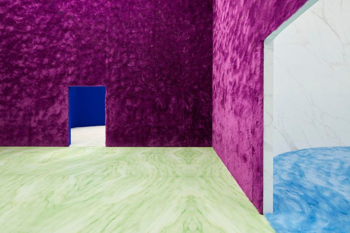 As Cathy Horyn mentioned in her review, Prada had similar trappings to Dries this season, but instead of marabou, it was all about faux fur. This extended beyond clothes. Rem Koolhaas and AMO designed a fuzzy set with walls I’m just dying to run my hands along. This deep purple one below made me realize that I have none of the color in my wardrobe, and that it would go really well with all the green and black I do have.
