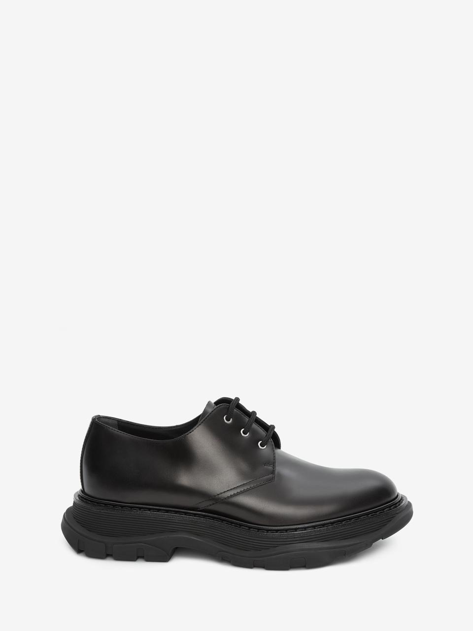 Courtesy of Alexander McQueenAlexander McQueen- Black calf leather lace-up with a thick oversized rubber tread sole and a rounded toe silhouette. Finished with an Alexander McQueen signature on the tongue. $840